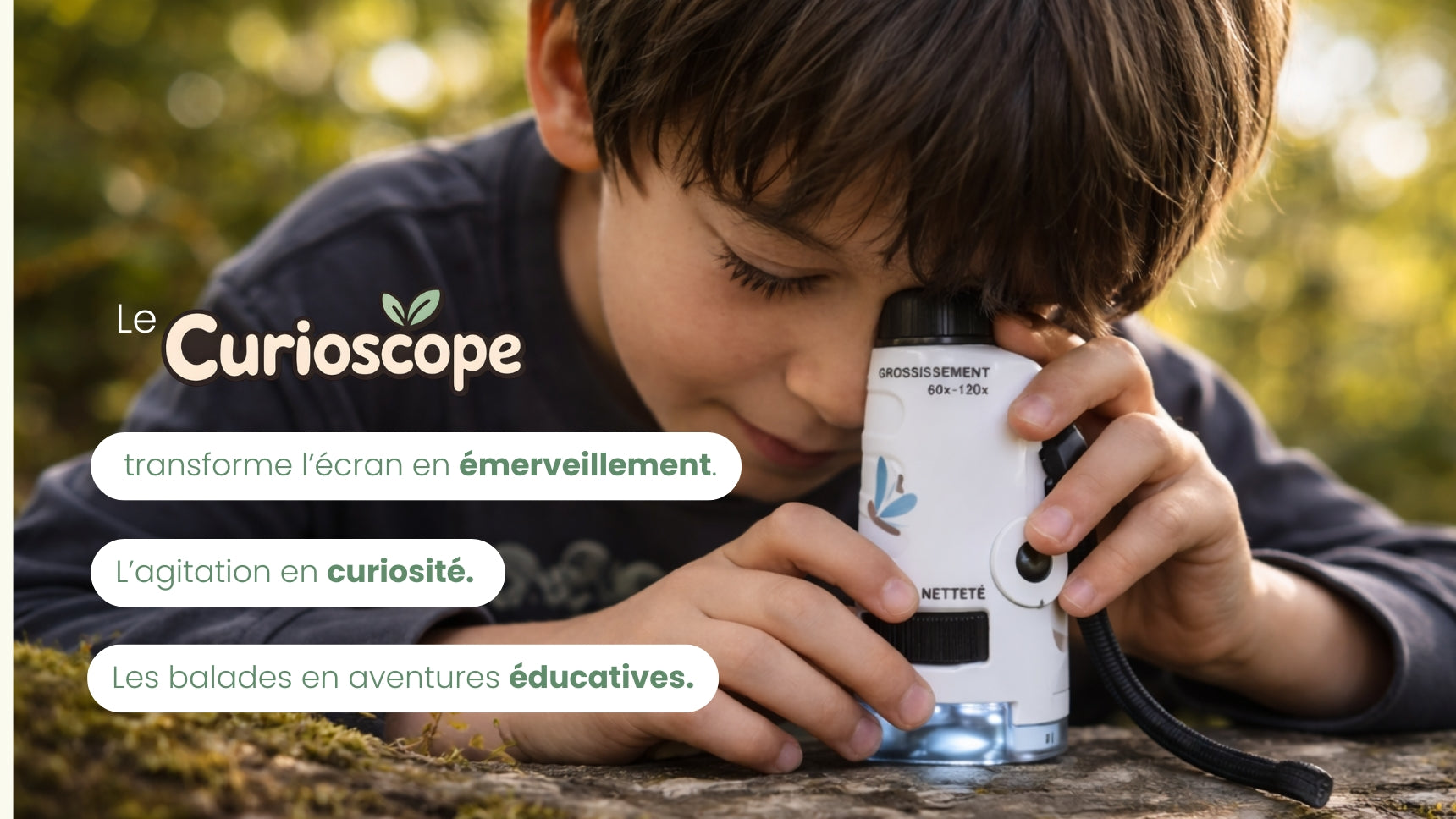 Le Curioscope est conçu pour suivre les enfants dans toutes leurs aventures. Il est robuste et adapté à une utilisation quotidienne, que ce soit à la maison, dans le jardin ou en balade.